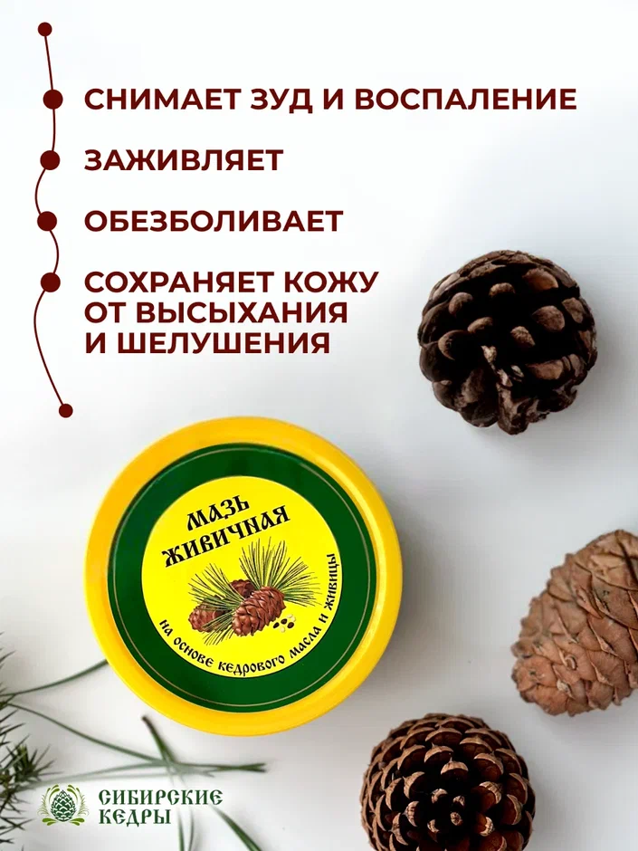 Состав мази "Живичной": живица (смола) кедра сибирского, собранная непосредственно с неподсоченных деревьев, масло кедровое холодного отжима (Сибирь), масло топленое, таежные эфирные масла, сабельник.